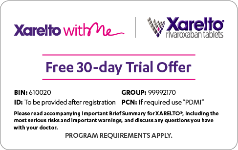 Eligible patients receive a free 30-day trial supply of XARELTO® with a valid signed 30-day prescription for any XARELTO® dose other than 10-mg tablet or 1 mg/mL oral suspension. The XARELTO withMe Trial Offer can also be used with the XARELTO® Starter Pack. At the conclusion of the program, you and your doctor can decide whether to continue treatment. Terms expire at the end of each calendar year and may change.